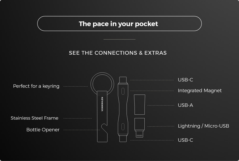 - Data and charging cable with fast charging capabilities (up to 60 watts) for your keychain.