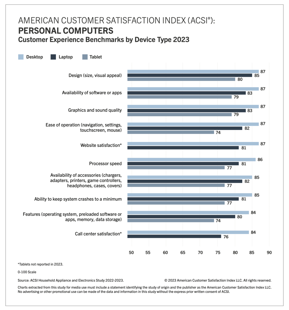 ACSI data shows that Apple continues to lead across much of the PC user experience but gets caught in a tie with Samsung for the top ACSI score (83). That’s a 2% improvement for Samsung with a 1% bump for Apple. This may not translate into sales, however.