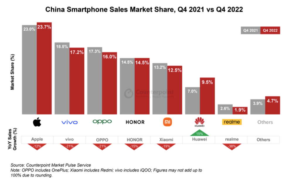 This should be good news for Apple, which tracked a record 23.7% share of China’s smartphone market in the December quarter. Cupertino outperformed the market across the year, Counterpoint said, with 18% share across the year. While Chinese smartphone sales fell 14% across the year, Apple experienced only a 3% decline, which means it has increased market share in this giant smartphone market.