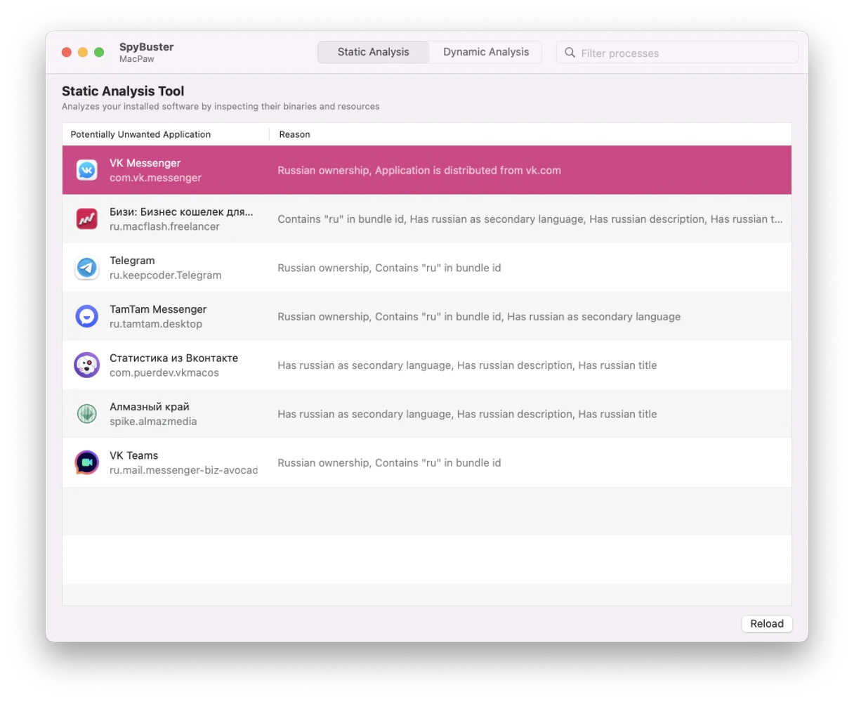 Static Analysis shows whether the app is somehow related to Russia, while Dynamic Analysis warns you when an app is trying to connect to servers there.