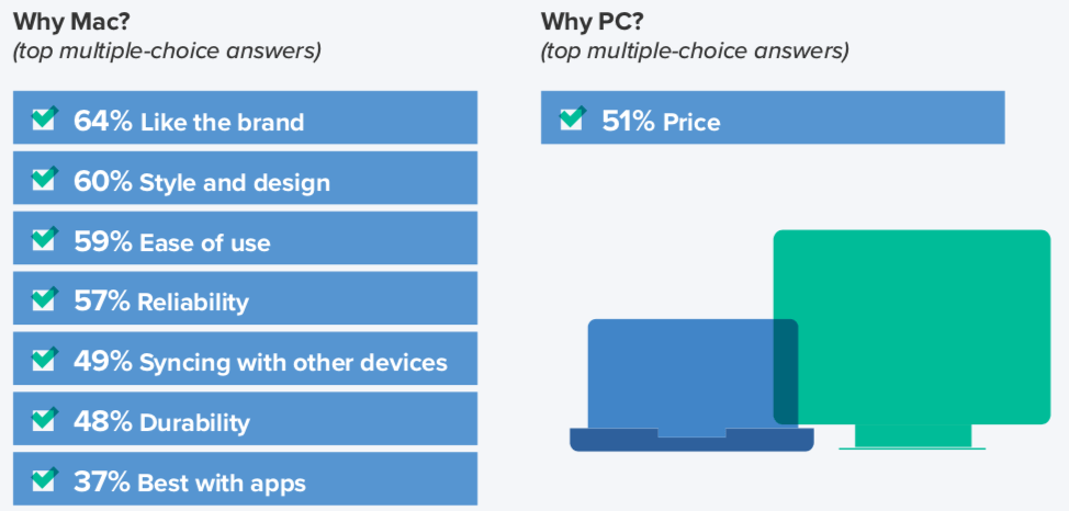 Students cited Mac platform advantages such as ease of use (59%), reliability (57%), durability (48%) and synchronization with other devices (49%).