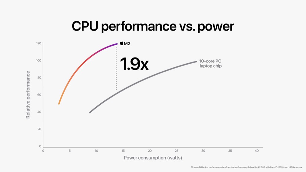 Apple claims that compared with the latest 10-core PC laptop chip, the CPU in M2 provides nearly twice the performance at the same power level. It also delivers the peak performance of the PC chip while using just a quarter of the power, the company says, citing tests using preproduction 13-inch MacBook Pro systems with Apple M2, 8-core CPU, 10-core GPU, and 16GB of RAM against a Samsung Galaxy Book2 360 (NP730QED-KA1US) with Core i7-1255U and 16GB of RAM.
